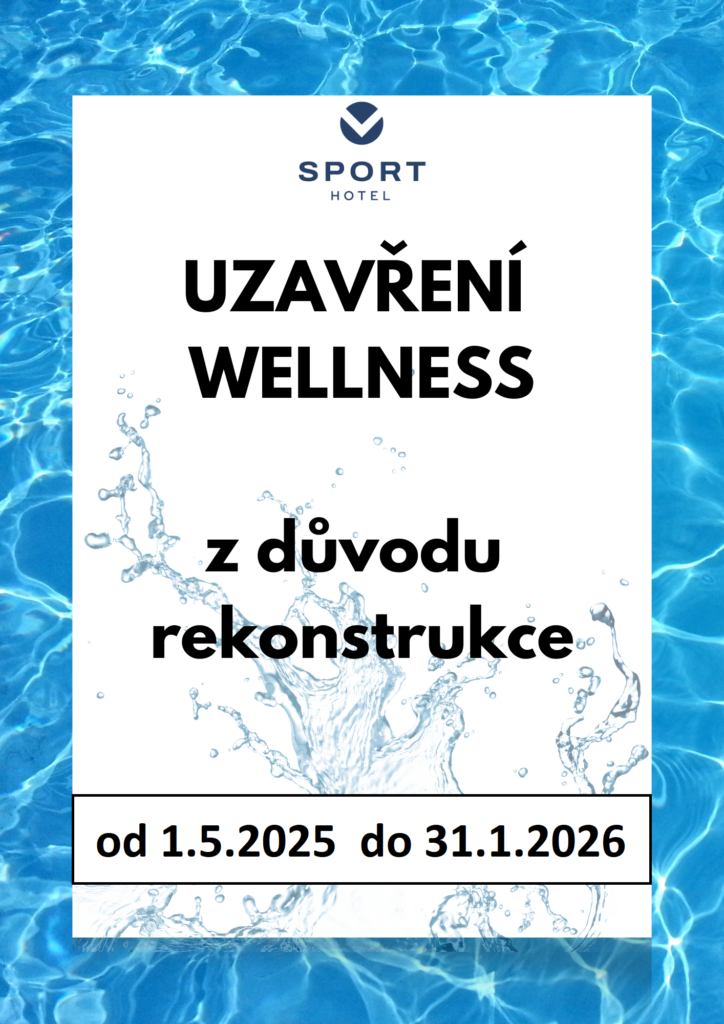 Z důvodu rekonstrukce je od 1.5.-31.1.2026 uzavřeno celé hotelové WELLNESS (tj.bazén,sauna,whirlpool).